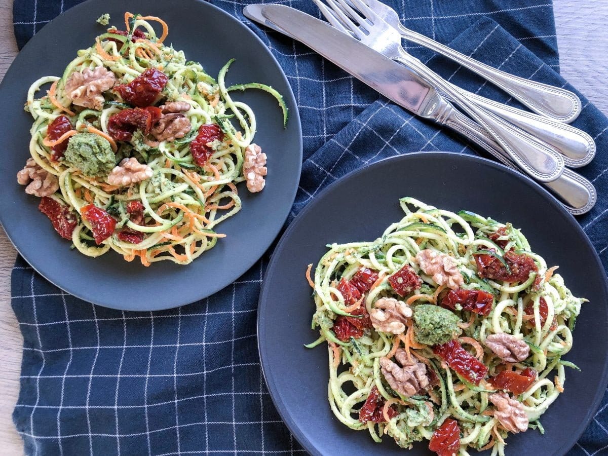 - Paskirstykite drauge su pesto sumaišytus spagečius į du dubenėlius. Sudėkite saulėje džiovintus pomidorus, užberkite graikinių riešutų ir į kiekvieną dubenėlį papildomai įdėkite po šaukštelį pesto. Ragaukite, kol cukinijos nepaleido visų savo sulčių.