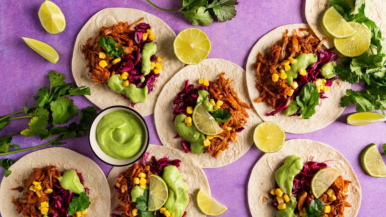 - Ant tortilijos dėkite marinuotą kopūstą, keptą barbekiu duonvaisį, konservuotus kukurūzus ir viską pagardinkite avokado-kalendros padažu.