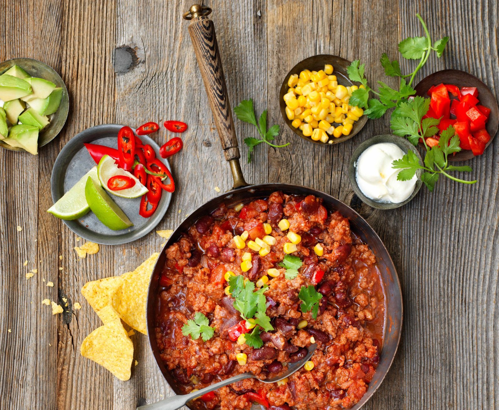 - Patiekite čili troškinį į atskirus dubenėlius ir pagardinkite smulkintais čili pipirais, avokadu, laimo sultimis, šviežia kalendra bei kukurūzais. Kiekvienas gali pasigaminti savo mėgstamą čili variantą! Rekomenduojame valgyti drauge su tortilijos traškučiais.