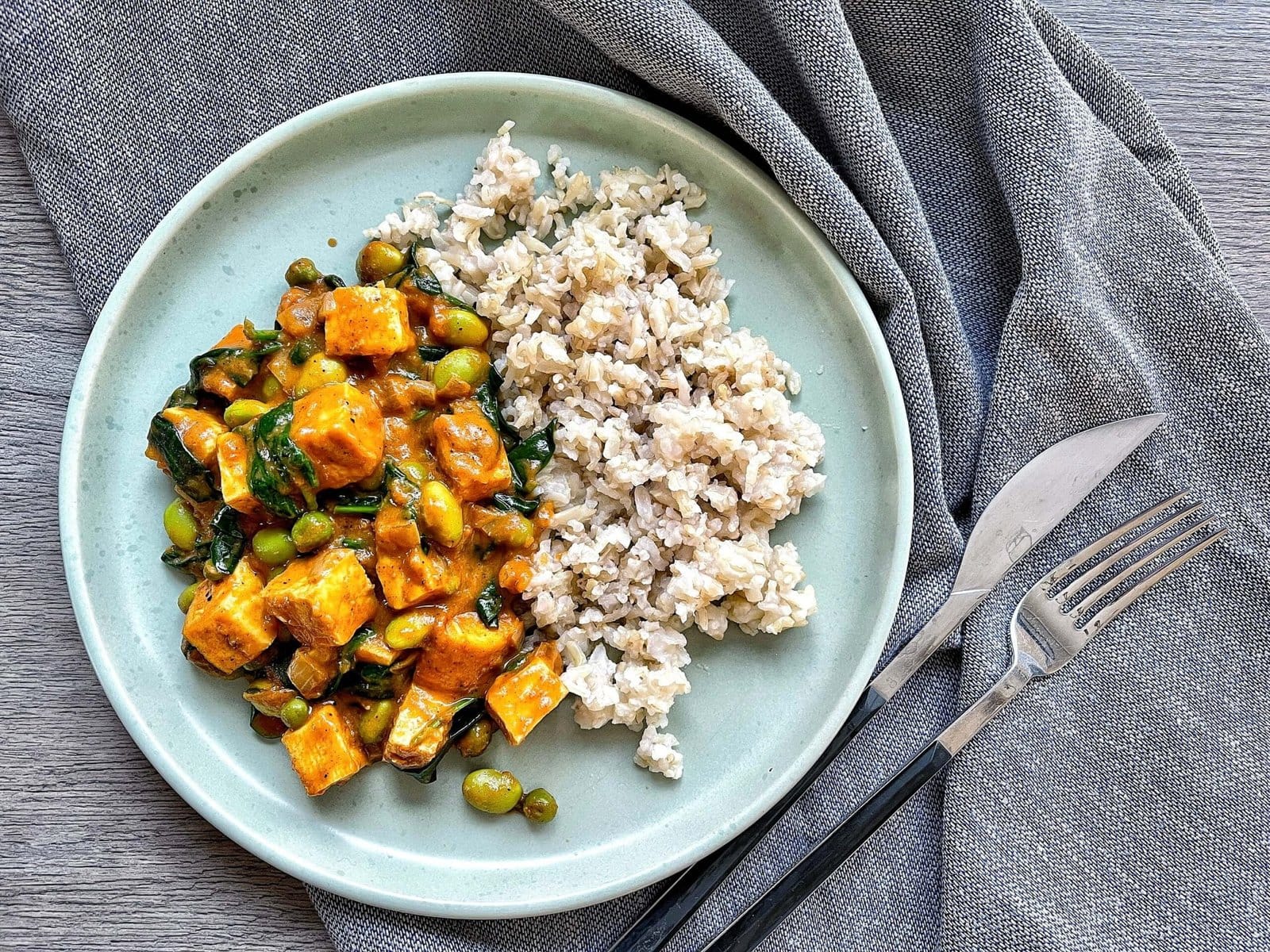 - Suberiame keptą tofu, edamame pupeles, žirnelius ir pakaitiname dar kelia kelias minutes, kol edamame ir žirneliai sušils. Tada suberiame špinatus, išmaišome, dar minutę pakaitiname kol špinatai sukris ir patraukiame keptuvę nuo kaitros.