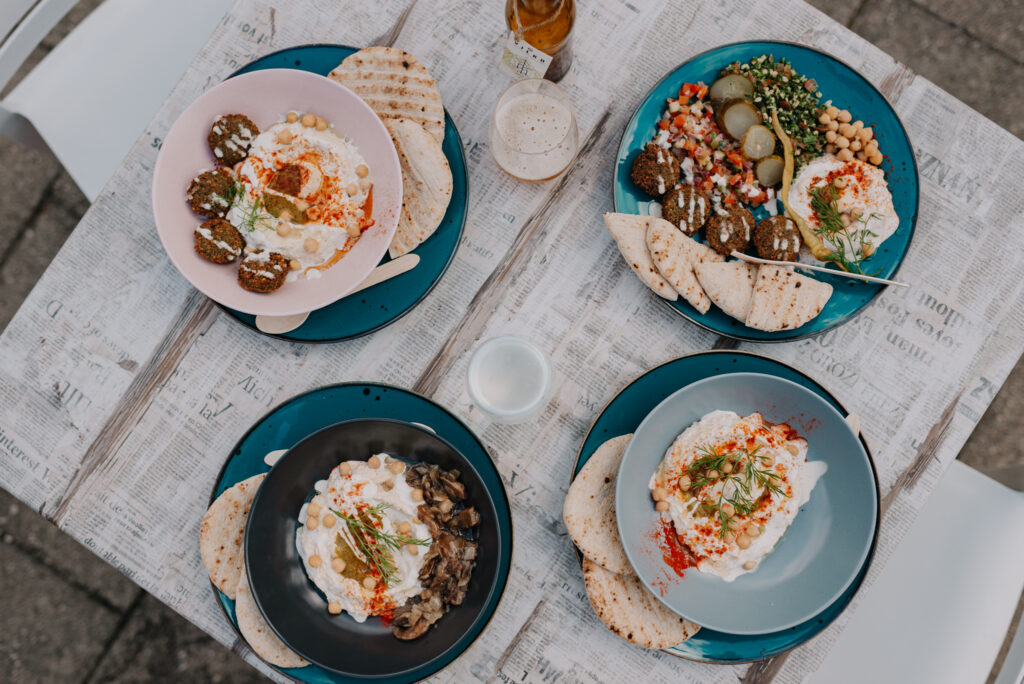 Spalvingosios falafelių lėkštės „Cvi parko“ terasoje | Viktorijos Gajauskaitės nuotr.